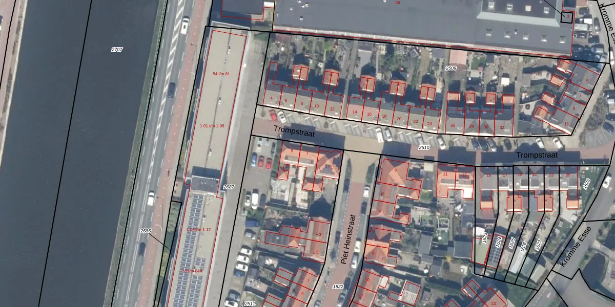 Trompstraat 7 is gelegen op kadastraal perceel WDV01G2511. Deze kadastrale aanduiding is uniek en wordt gebruikt door het Kadaster om eigendomsrechten en andere zakelijke rechten vast te leggen. Het perceel maakt onderdeel uit van de kadastrale gemeente Waddinxveen.