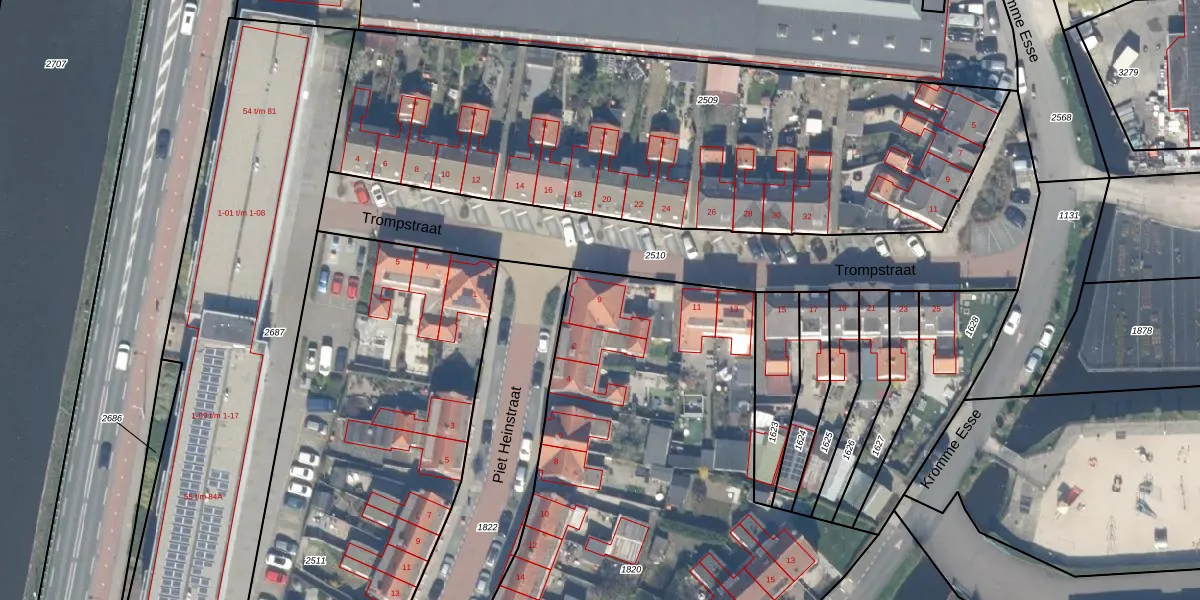 Trompstraat 9 is gelegen op kadastraal perceel WDV01G1820. Deze kadastrale aanduiding is uniek en wordt gebruikt door het Kadaster om eigendomsrechten en andere zakelijke rechten vast te leggen. Het perceel maakt onderdeel uit van de kadastrale gemeente Waddinxveen.