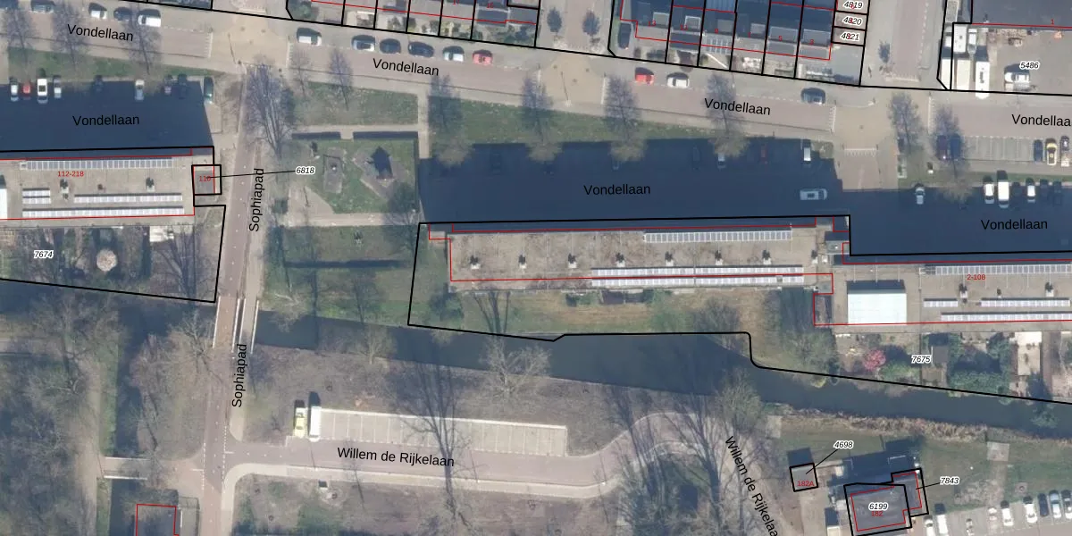 Het perceel waarop Vondellaan 102 staat heeft een oppervlakte van 3163 m². Dit is een zeer groot perceel. De perceeloppervlakte wordt geregistreerd door het Kadaster. Gedetailleerde informatie over de maten van dit perceel kunt u vinden in het rapport Kadastrale kaart met maatvoering van Vondellaan 102.