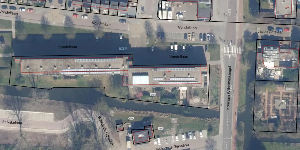 Het perceel waarop Vondellaan 12 staat heeft een oppervlakte van 3163 m². Dit is een zeer groot perceel. De perceeloppervlakte wordt geregistreerd door het Kadaster. Gedetailleerde informatie over de maten van dit perceel kunt u vinden in het rapport Kadastrale kaart met maatvoering van Vondellaan 12.