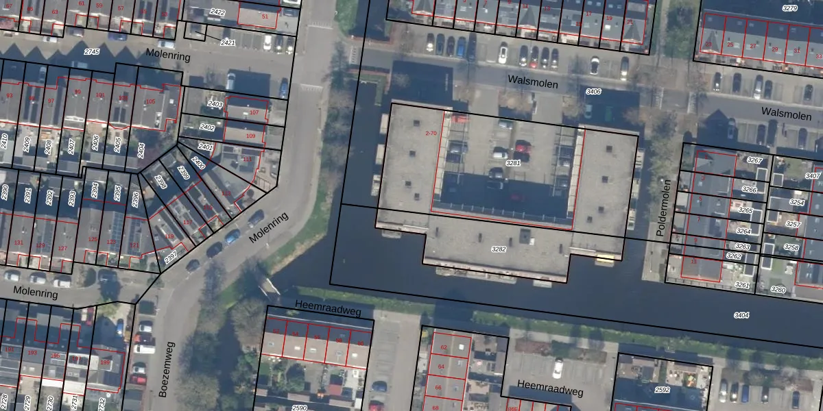 Het adres ligt op het perceel WDV01-D-3281, dat zich in de kadastrale gemeente Waddinxveen bevindt. Het perceel is kleiner dan gemiddeld in Waddinxveen. Het perceel is 1535 m² groot, terwijl het gemiddelde ligt op 2158,97 m². Het kleinste perceel in de kadastrale gemeente is 0 m² groot. De grootste perceeloppervlakte is 49,8 ha. Er zijn 24 adressen aanwezig op het perceel. In de Basisregistratie Kadaster (BRK) werden de grenzen van het perceel geregistreerd op 21-08-2014.