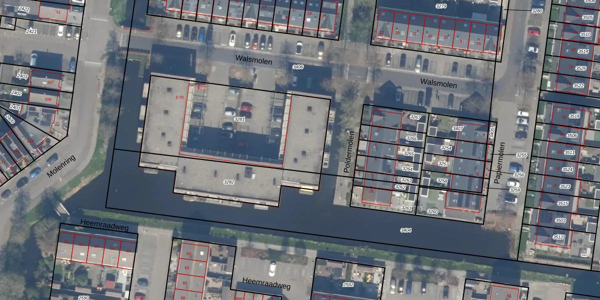 Het adres ligt op het perceel WDV01-D-3281, dat zich in de kadastrale gemeente Waddinxveen bevindt. Het perceel is kleiner dan gemiddeld in Waddinxveen. Het perceel is 1535 m² groot, terwijl het gemiddelde ligt op 2158,97 m². Het kleinste perceel in de kadastrale gemeente is 0 m² groot. De grootste perceeloppervlakte is 49,8 ha. Er zijn 24 adressen aanwezig op het perceel. In de Basisregistratie Kadaster (BRK) werden de grenzen van het perceel geregistreerd op 21-08-2014.