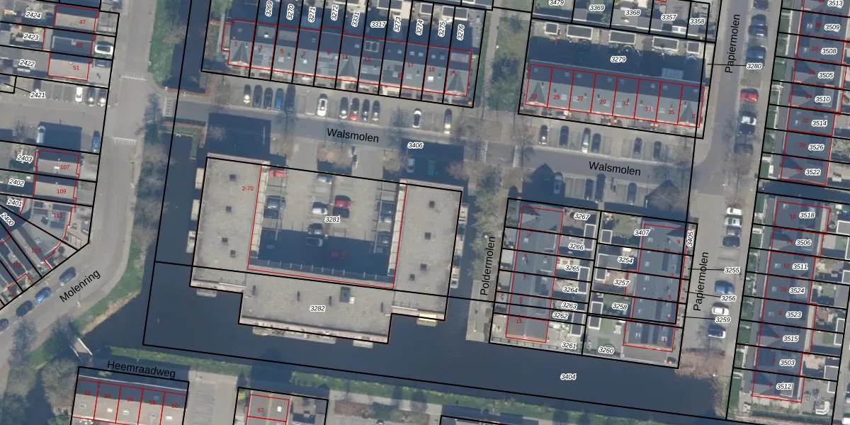Het adres ligt op het perceel WDV01-D-3281, dat zich in de kadastrale gemeente Waddinxveen bevindt. Het perceel is kleiner dan gemiddeld in Waddinxveen. Het perceel is 1535 m² groot, terwijl het gemiddelde ligt op 2158,97 m². Het kleinste perceel in de kadastrale gemeente is 0 m² groot. De grootste perceeloppervlakte is 49,8 ha. Op het perceel zijn 24 adressen aanwezig. In de Basisregistratie Kadaster (BRK) werden de grenzen van het perceel geregistreerd op 21-08-2014.