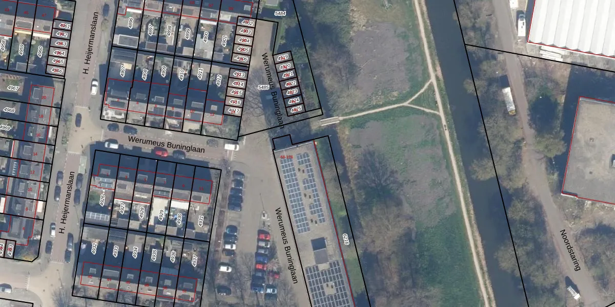 Werumeus Buninglaan 112 is gelegen op kadastraal perceel WDV01B6216. Deze kadastrale aanduiding is uniek en wordt gebruikt door het Kadaster om eigendomsrechten en andere zakelijke rechten vast te leggen. Het perceel maakt onderdeel uit van de kadastrale gemeente Waddinxveen.