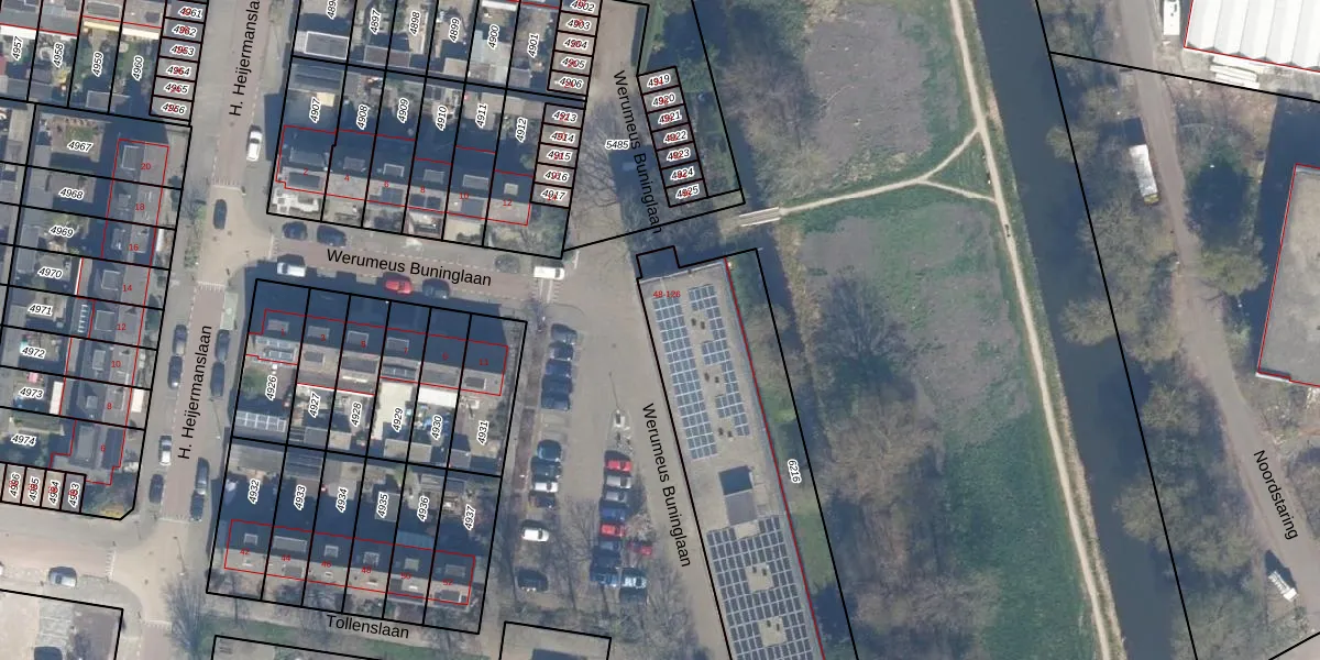 Werumeus Buninglaan 48-A is gelegen op kadastraal perceel WDV01B6216. Deze kadastrale aanduiding is uniek en wordt gebruikt door het Kadaster om eigendomsrechten en andere zakelijke rechten vast te leggen. Het perceel maakt onderdeel uit van de kadastrale gemeente Waddinxveen.