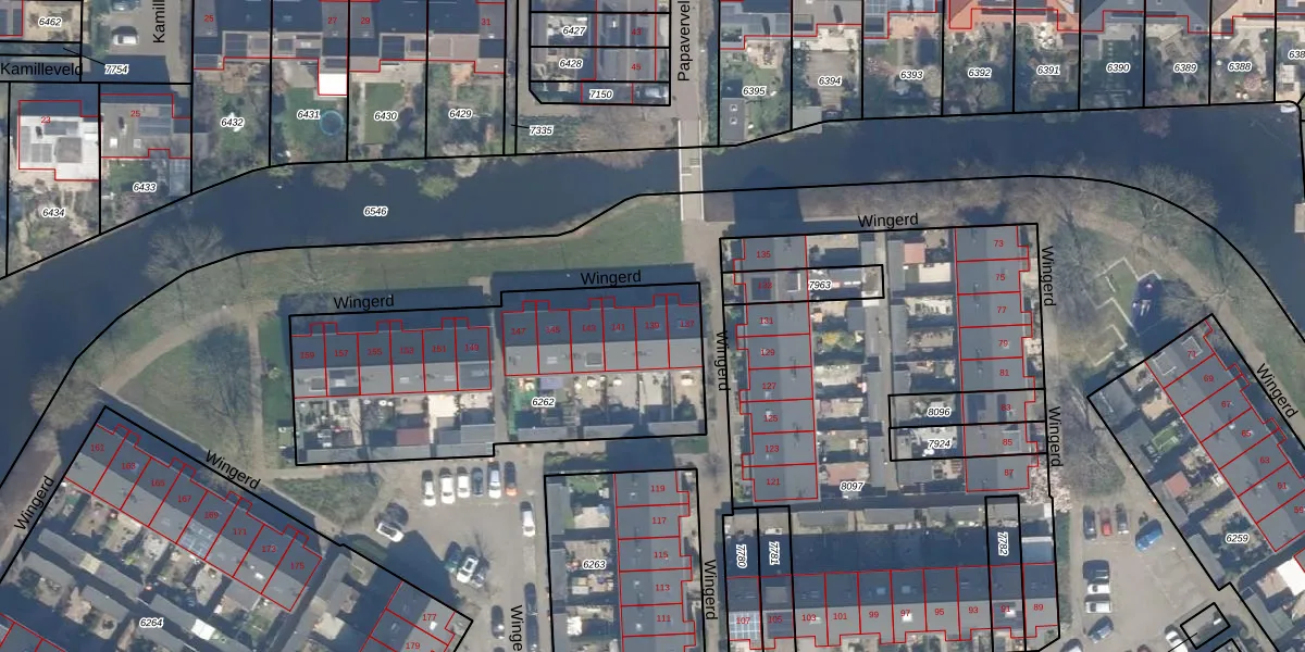 Het perceel waarop Wingerd 139 staat heeft een oppervlakte van 1443 m². Dit is een zeer groot perceel. De perceeloppervlakte wordt geregistreerd door het Kadaster. Gedetailleerde informatie over de maten van dit perceel kunt u vinden in het rapport Kadastrale kaart met maatvoering van Wingerd 139.