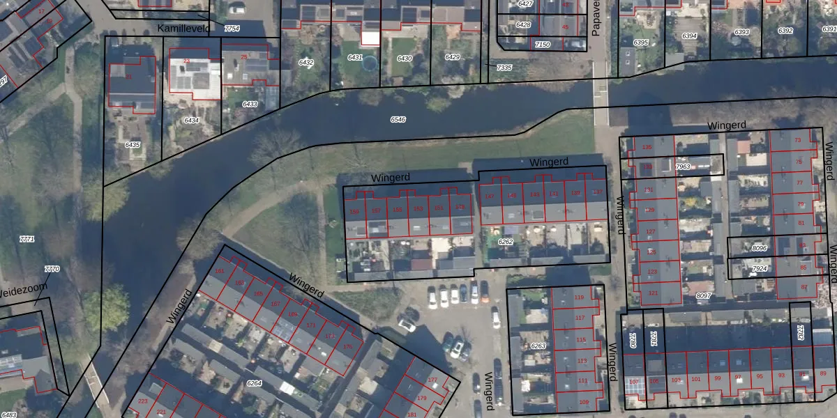 Het perceel waarop Wingerd 153 staat heeft een oppervlakte van 1443 m². Dit is een zeer groot perceel. De perceeloppervlakte wordt geregistreerd door het Kadaster. Gedetailleerde informatie over de maten van dit perceel kunt u vinden in het rapport Kadastrale kaart met maatvoering van Wingerd 153.