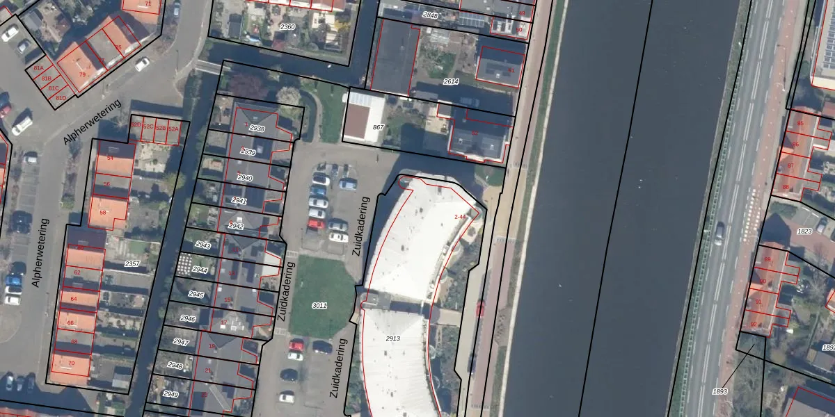 Zuidkadering 38 is gelegen op kadastraal perceel WDV01D2913. Deze kadastrale aanduiding is uniek en wordt gebruikt door het Kadaster om eigendomsrechten en andere zakelijke rechten vast te leggen. Het perceel maakt onderdeel uit van de kadastrale gemeente Waddinxveen.