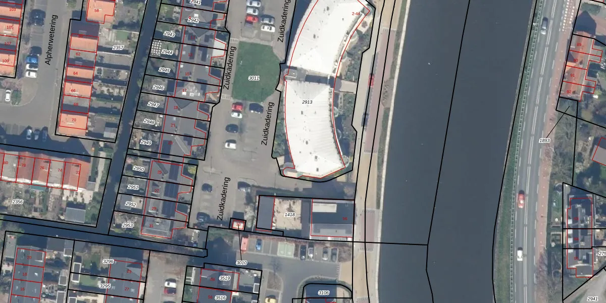 Zuidkadering 44 is gelegen op kadastraal perceel WDV01D2913. Deze kadastrale aanduiding is uniek en wordt gebruikt door het Kadaster om eigendomsrechten en andere zakelijke rechten vast te leggen. Het perceel maakt onderdeel uit van de kadastrale gemeente Waddinxveen.