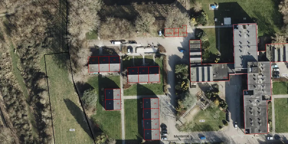Het perceel waarop Menterne 21 staat heeft een oppervlakte van 2,9 ha. Dit is een zeer groot perceel. De perceeloppervlakte wordt geregistreerd door het Kadaster. Gedetailleerde informatie over de maten van dit perceel kunt u vinden in het rapport Kadastrale kaart met maatvoering van Menterne 21.