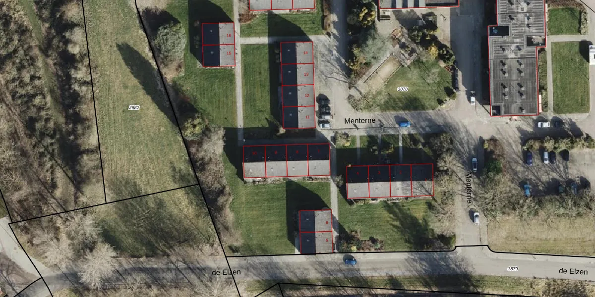 Het perceel waarop Menterne 8 staat heeft een oppervlakte van 2,9 ha. Dit is een zeer groot perceel. De perceeloppervlakte wordt geregistreerd door het Kadaster. Gedetailleerde informatie over de maten van dit perceel kunt u vinden in het rapport Kadastrale kaart met maatvoering van Menterne 8.