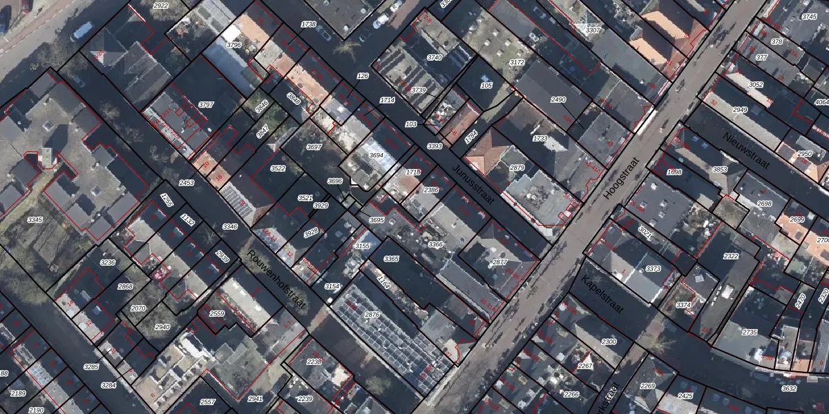 Het perceel waarop Junusstraat 15 staat heeft een oppervlakte van 84 m². Dit is een klein perceel. De perceeloppervlakte wordt geregistreerd door het Kadaster. Gedetailleerde informatie over de maten van dit perceel kunt u vinden in het rapport Kadastrale kaart met maatvoering van Junusstraat 15.