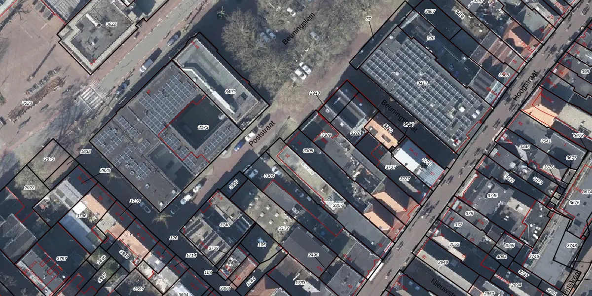Het perceel waarop Poststraat 24 staat heeft een oppervlakte van 335 m². Dit is een groot perceel. De perceeloppervlakte wordt geregistreerd door het Kadaster. Gedetailleerde informatie over de maten van dit perceel kunt u vinden in het rapport Kadastrale kaart met maatvoering van Poststraat 24.