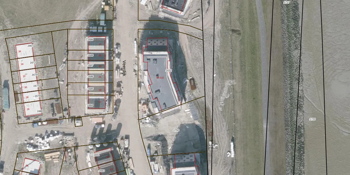 Het perceel waarop Veerdijk 106 staat heeft een oppervlakte van 1645 m². Dit is een zeer groot perceel. De perceeloppervlakte wordt geregistreerd door het Kadaster. Gedetailleerde informatie over de maten van dit perceel kunt u vinden in het rapport Kadastrale kaart met maatvoering van Veerdijk 106.