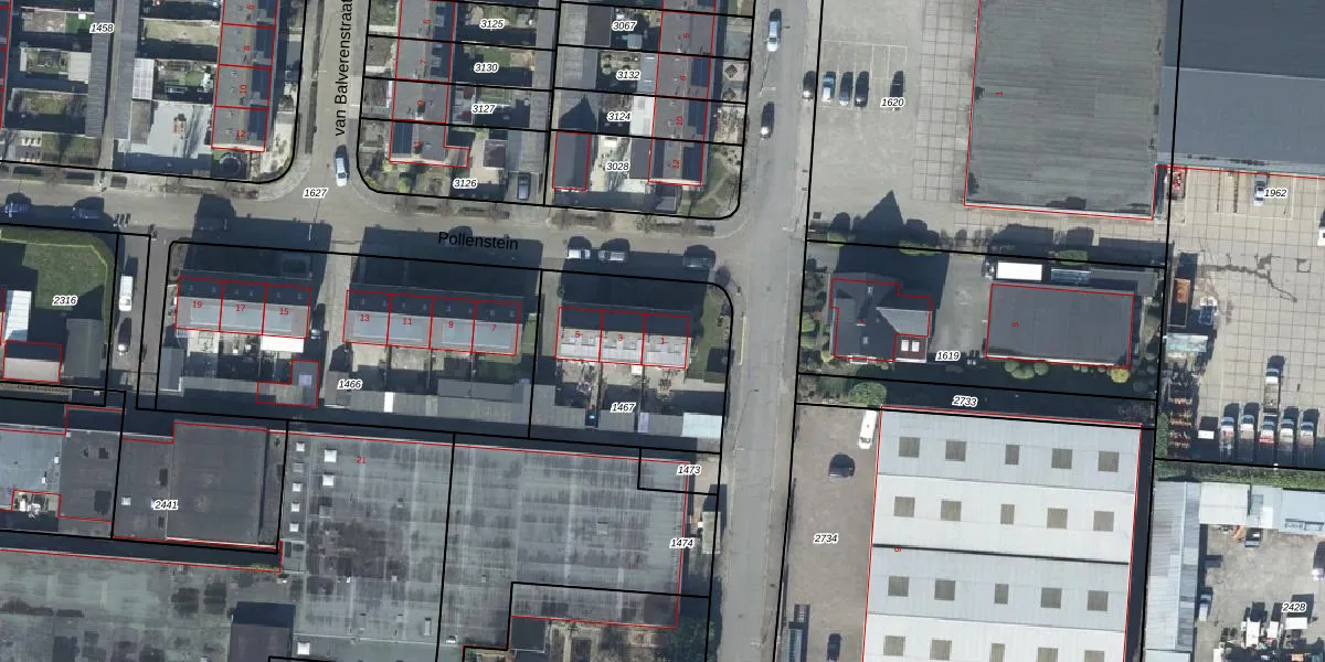 Het perceel waarop Pollenstein 1 staat heeft een oppervlakte van 733 m². Dit is een groot perceel. De perceeloppervlakte wordt geregistreerd door het Kadaster. Gedetailleerde informatie over de maten van dit perceel kunt u vinden in het rapport Kadastrale kaart met maatvoering van Pollenstein 1.