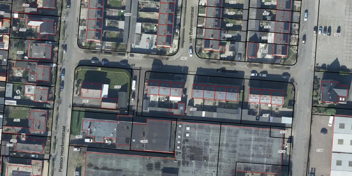 Het perceel waarop Pollenstein 15 staat heeft een oppervlakte van 1437 m². Dit is een zeer groot perceel. De perceeloppervlakte wordt geregistreerd door het Kadaster. Gedetailleerde informatie over de maten van dit perceel kunt u vinden in het rapport Kadastrale kaart met maatvoering van Pollenstein 15.