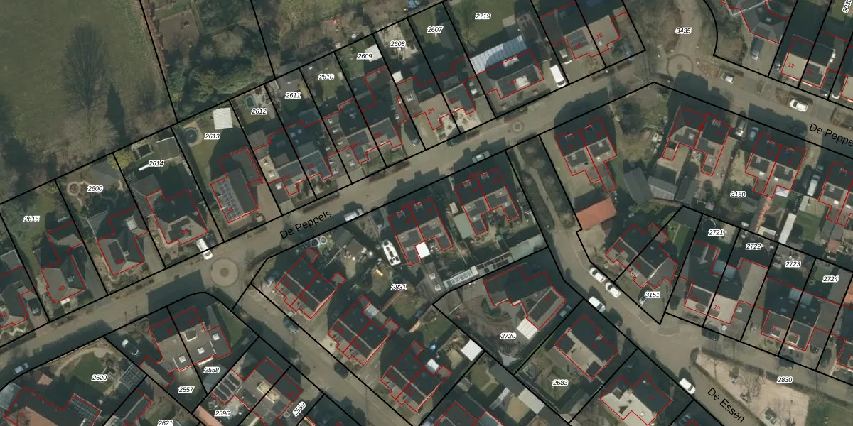 Het perceel waarop De Peppels 27 staat heeft een oppervlakte van 2119 m². Dit is een zeer groot perceel. De perceeloppervlakte wordt geregistreerd door het Kadaster. Gedetailleerde informatie over de maten van dit perceel kunt u vinden in het rapport Kadastrale kaart met maatvoering van De Peppels 27.