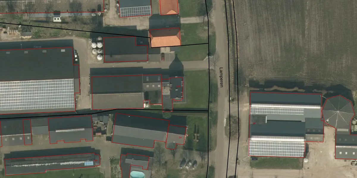 Het perceel waarop Lamperen 12-A staat heeft een oppervlakte van 5,9 ha. Dit is een zeer groot perceel. De perceeloppervlakte wordt geregistreerd door het Kadaster. Gedetailleerde informatie over de maten van dit perceel kunt u vinden in het rapport Kadastrale kaart met maatvoering van Lamperen 12-A.
