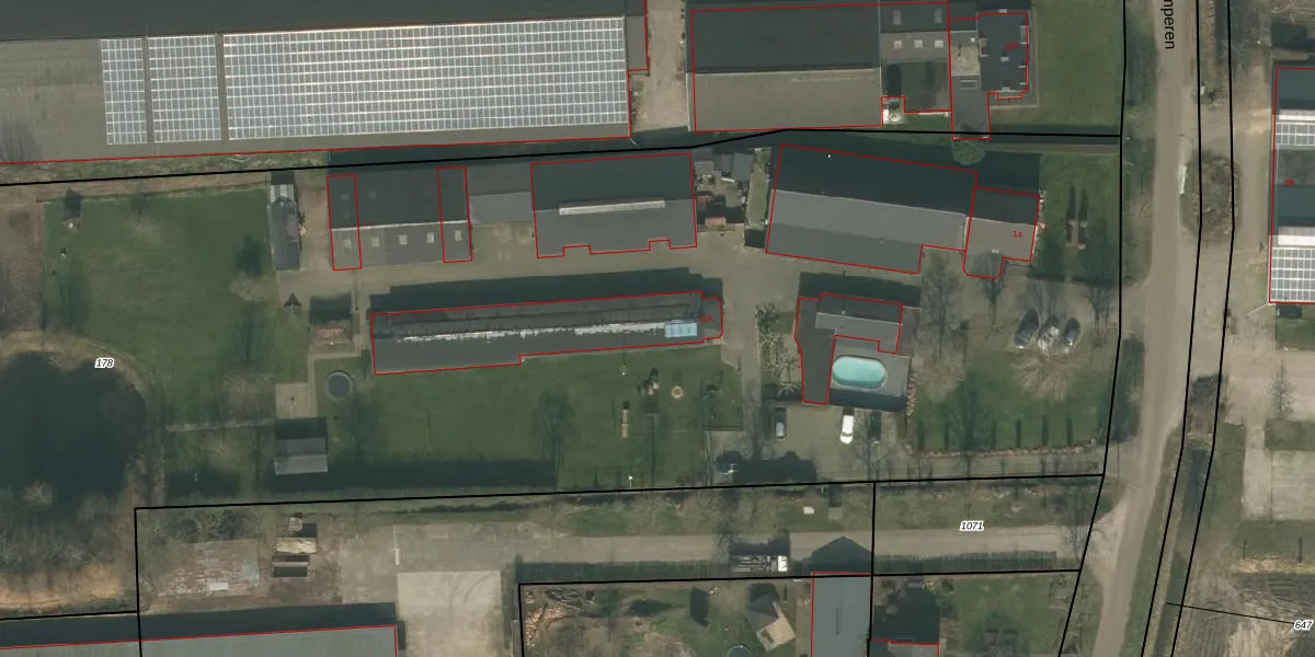 Het perceel waarop Lamperen 14-A staat heeft een oppervlakte van 1,6 ha. Dit is een zeer groot perceel. De perceeloppervlakte wordt geregistreerd door het Kadaster. Gedetailleerde informatie over de maten van dit perceel kunt u vinden in het rapport Kadastrale kaart met maatvoering van Lamperen 14-A.