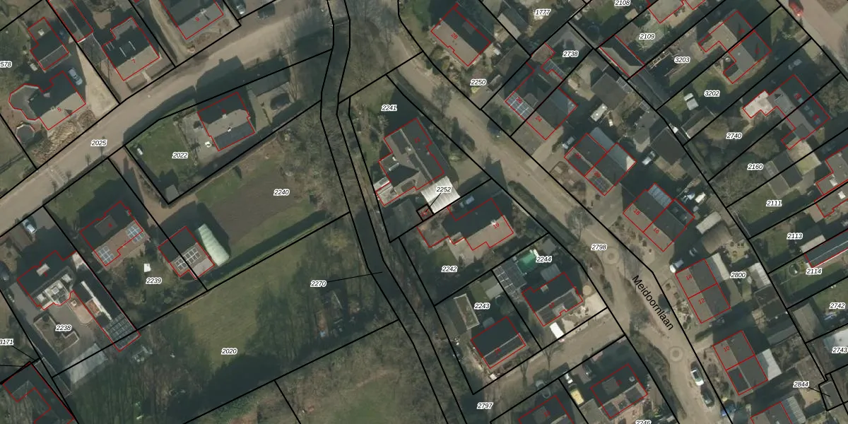 Het perceel waarop Meidoornlaan 21-T staat heeft een oppervlakte van 9 m². Dit is een klein perceel. De perceeloppervlakte wordt geregistreerd door het Kadaster. Gedetailleerde informatie over de maten van dit perceel kunt u vinden in het rapport Kadastrale kaart met maatvoering van Meidoornlaan 21-T.
