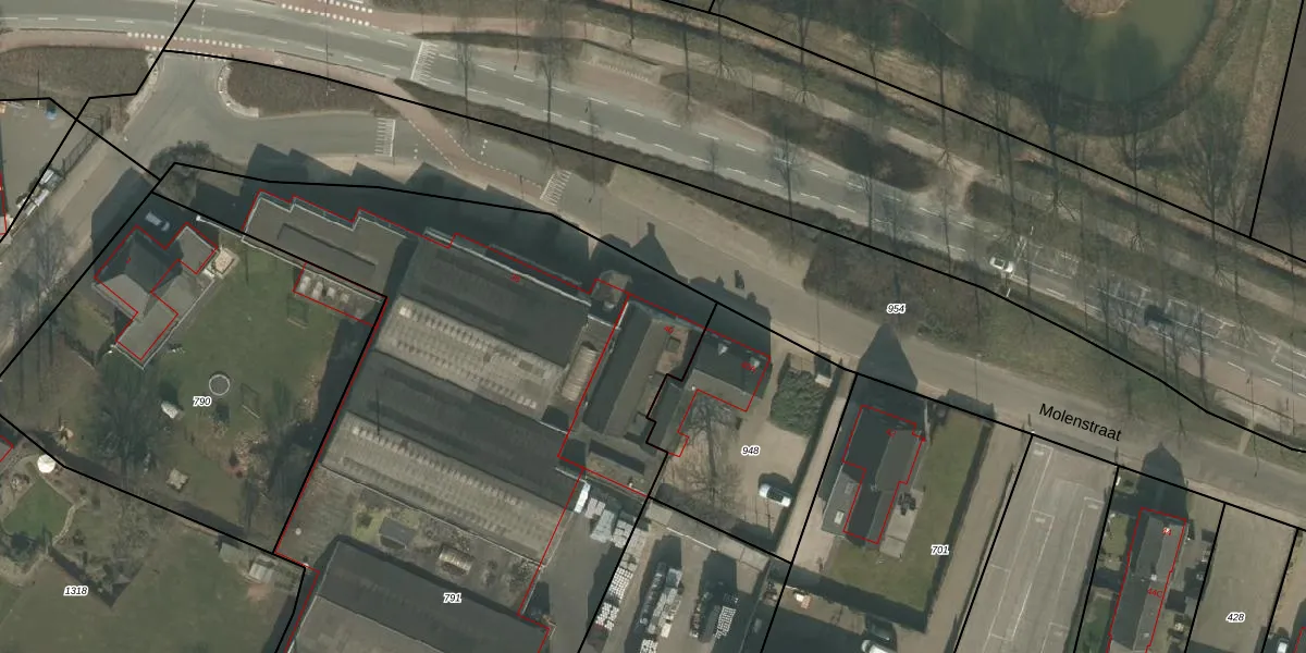 Het perceel waarop Molenstraat 40 staat heeft een oppervlakte van 4925 m². Dit is een zeer groot perceel. De perceeloppervlakte wordt geregistreerd door het Kadaster. Gedetailleerde informatie over de maten van dit perceel kunt u vinden in het rapport Kadastrale kaart met maatvoering van Molenstraat 40.
