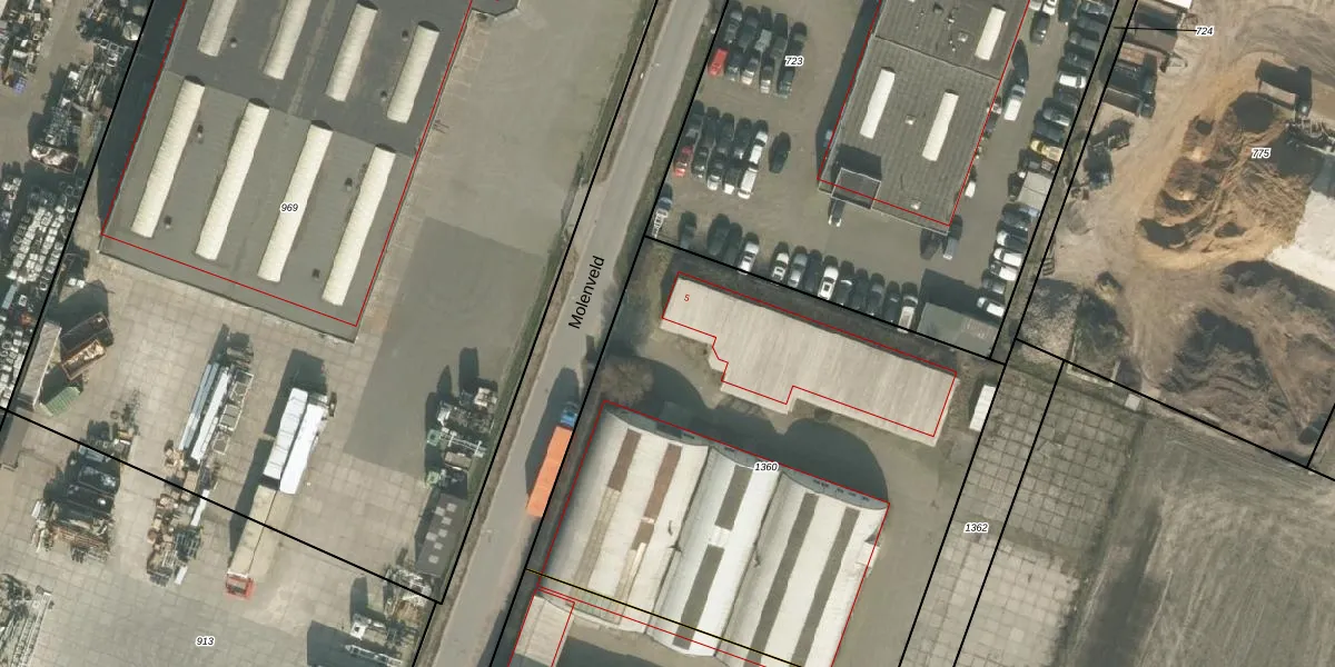 Het perceel waarop Molenveld 5-z staat heeft een oppervlakte van 3056 m². Dit is een zeer groot perceel. De perceeloppervlakte wordt geregistreerd door het Kadaster. Gedetailleerde informatie over de maten van dit perceel kunt u vinden in het rapport Kadastrale kaart met maatvoering van Molenveld 5-z.