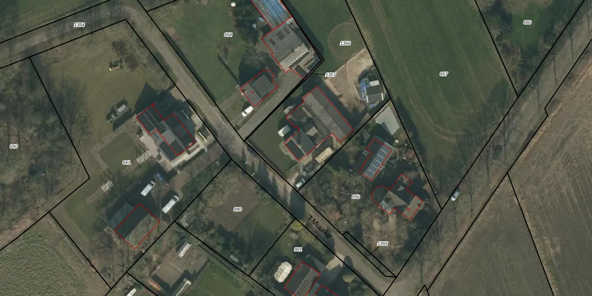 Het perceel waarop 't Muurke 2 staat heeft een oppervlakte van 1841 m². Dit is een zeer groot perceel. De perceeloppervlakte wordt geregistreerd door het Kadaster. Gedetailleerde informatie over de maten van dit perceel kunt u vinden in het rapport Kadastrale kaart met maatvoering van 't Muurke 2.