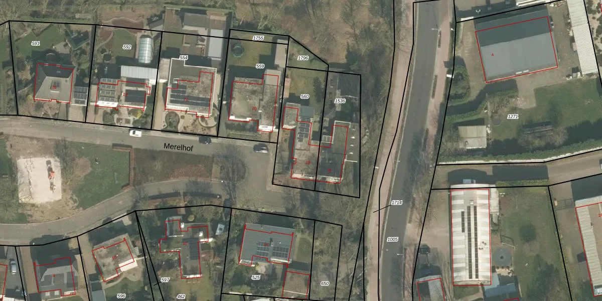 Het perceel waarop Merelhof 18 staat heeft een oppervlakte van 564 m². Dit is een groot perceel. De perceeloppervlakte wordt geregistreerd door het Kadaster. Gedetailleerde informatie over de maten van dit perceel kunt u vinden in het rapport Kadastrale kaart met maatvoering van Merelhof 18.