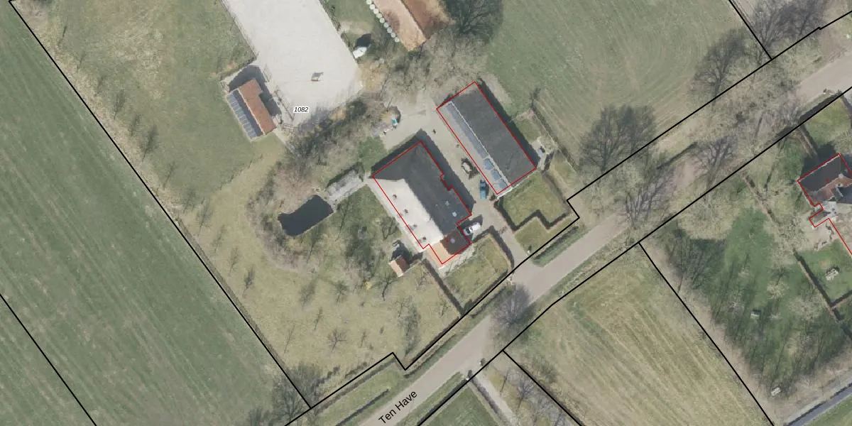 Het perceel waarop Ten Have 2 staat heeft een oppervlakte van 1,5 ha. Dit is een zeer groot perceel. De perceeloppervlakte wordt geregistreerd door het Kadaster. Gedetailleerde informatie over de maten van dit perceel kunt u vinden in het rapport Kadastrale kaart met maatvoering van Ten Have 2.