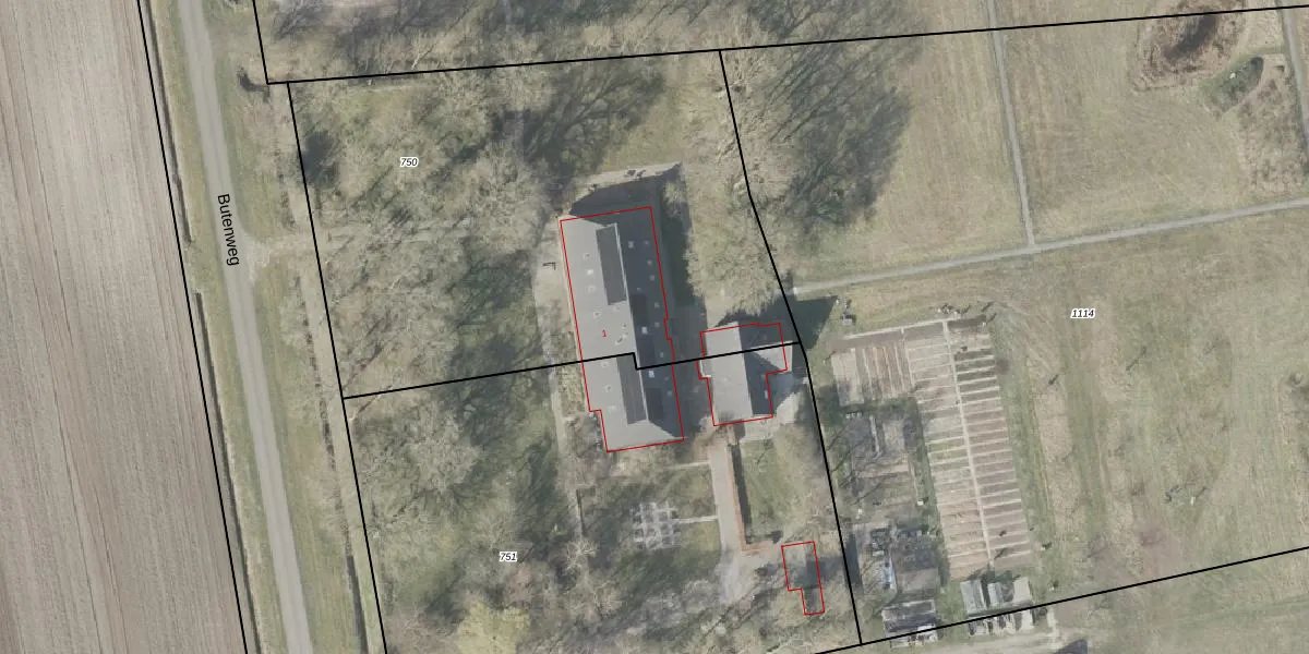 Het perceel waarop Butenweg 1 staat heeft een oppervlakte van 3232 m². Dit is een zeer groot perceel. De perceeloppervlakte wordt geregistreerd door het Kadaster. Gedetailleerde informatie over de maten van dit perceel kunt u vinden in het rapport Kadastrale kaart met maatvoering van Butenweg 1.