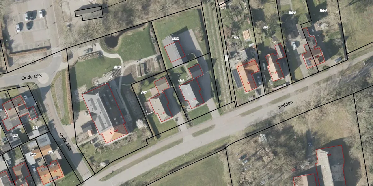 Het perceel waarop Midden 59 staat heeft een oppervlakte van 604 m². Dit is een groot perceel. De perceeloppervlakte wordt geregistreerd door het Kadaster. Gedetailleerde informatie over de maten van dit perceel kunt u vinden in het rapport Kadastrale kaart met maatvoering van Midden 59.