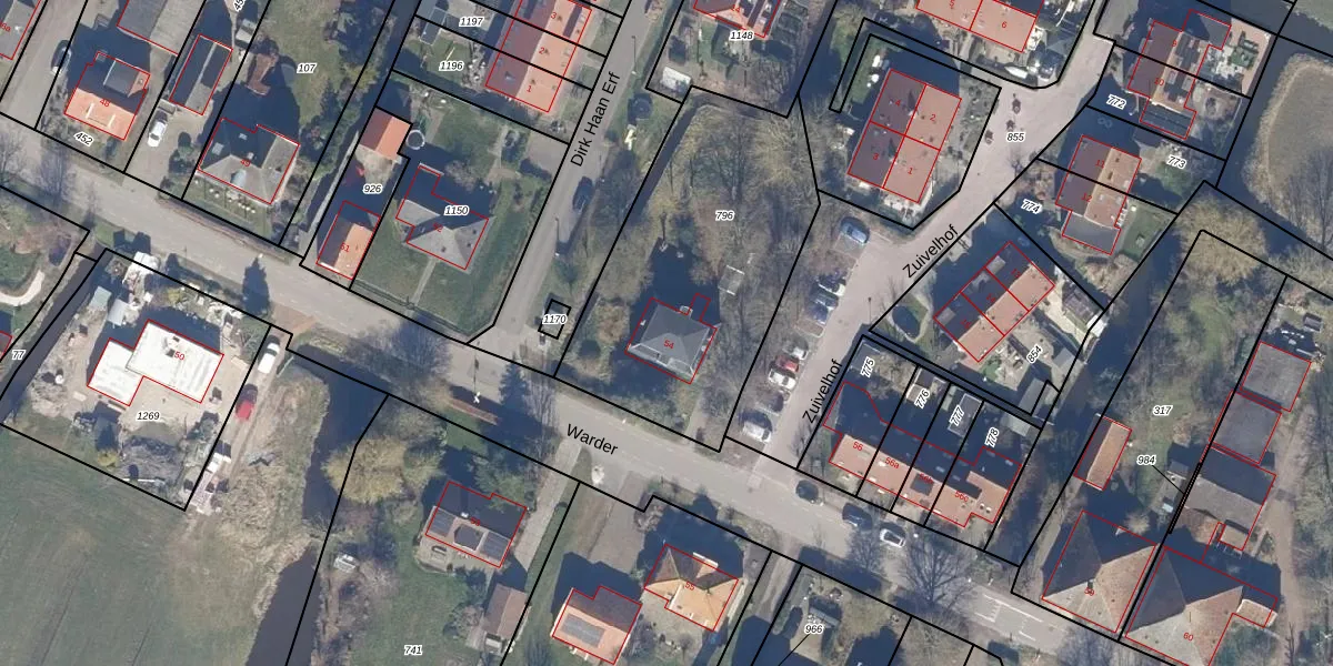 Het perceel waarop Warder 54 staat heeft een oppervlakte van 1260 m². Dit is een zeer groot perceel. De perceeloppervlakte wordt geregistreerd door het Kadaster. Gedetailleerde informatie over de maten van dit perceel kunt u vinden in het rapport Kadastrale kaart met maatvoering van Warder 54.