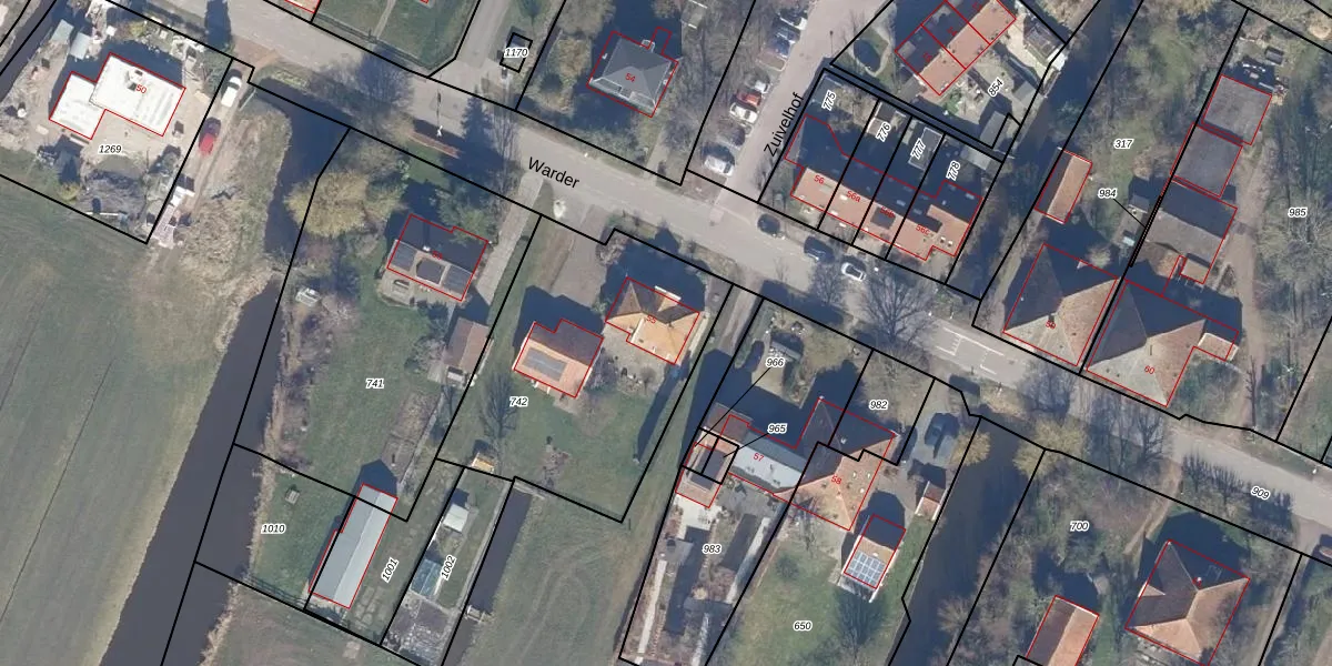 Het perceel waarop Warder 55 staat heeft een oppervlakte van 1160 m². Dit is een zeer groot perceel. De perceeloppervlakte wordt geregistreerd door het Kadaster. Gedetailleerde informatie over de maten van dit perceel kunt u vinden in het rapport Kadastrale kaart met maatvoering van Warder 55.