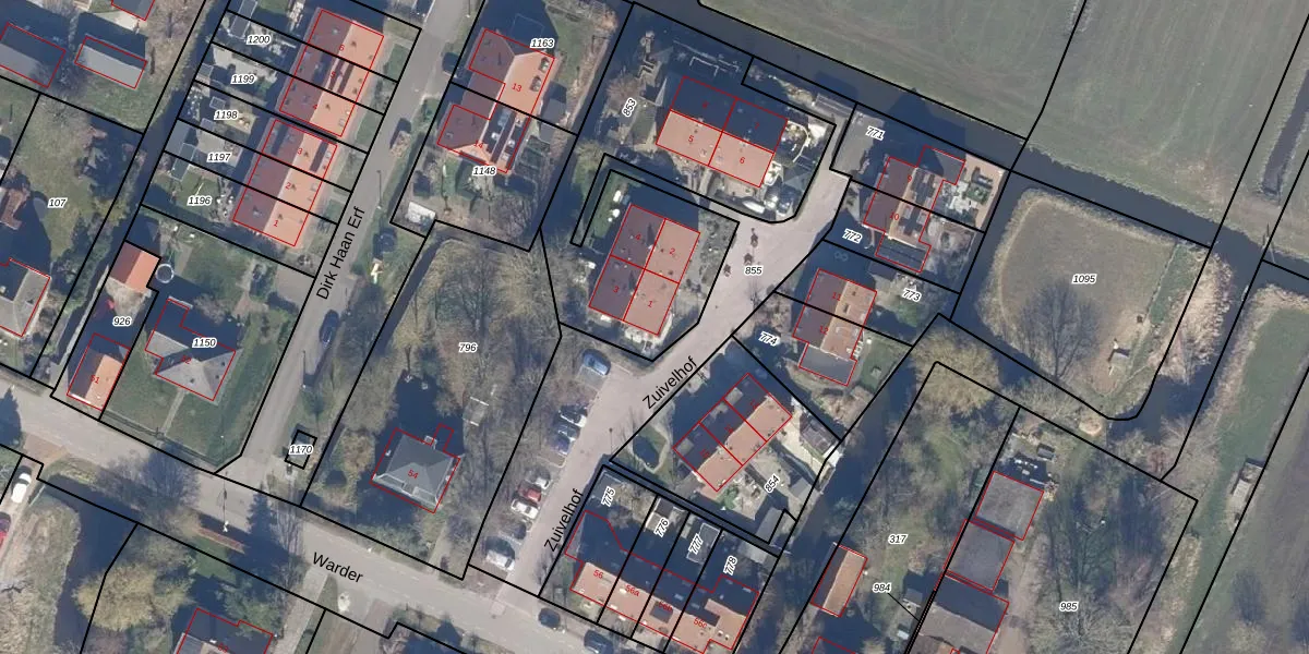 Zuivelhof 1 is gelegen op kadastraal perceel WDR01C853. Deze kadastrale aanduiding is uniek en wordt gebruikt door het Kadaster om eigendomsrechten en andere zakelijke rechten vast te leggen. Het perceel maakt onderdeel uit van de kadastrale gemeente Warder.