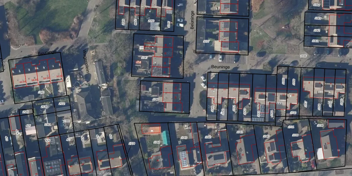 Het perceel waarop Beuninge 30 staat heeft een oppervlakte van 493 m². Dit is een groot perceel. De perceeloppervlakte wordt geregistreerd door het Kadaster. Gedetailleerde informatie over de maten van dit perceel kunt u vinden in het rapport Kadastrale kaart met maatvoering van Beuninge 30.