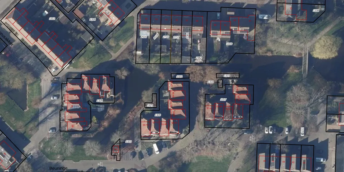 Het perceel waarop Beuninge 43 staat heeft een oppervlakte van 760 m². Dit is een groot perceel. De perceeloppervlakte wordt geregistreerd door het Kadaster. Gedetailleerde informatie over de maten van dit perceel kunt u vinden in het rapport Kadastrale kaart met maatvoering van Beuninge 43.