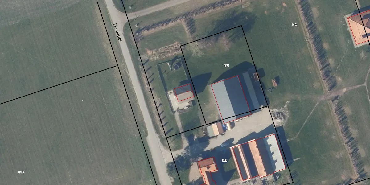 Het perceel waarop De Groet 4 staat heeft een oppervlakte van 2,1 ha. Dit is een zeer groot perceel. De perceeloppervlakte wordt geregistreerd door het Kadaster. Gedetailleerde informatie over de maten van dit perceel kunt u vinden in het rapport Kadastrale kaart met maatvoering van De Groet 4.