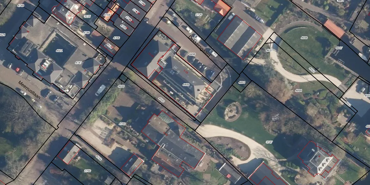 Het perceel waarop Dekkersgaard 9 staat heeft een oppervlakte van 1203 m². Dit is een zeer groot perceel. De perceeloppervlakte wordt geregistreerd door het Kadaster. Gedetailleerde informatie over de maten van dit perceel kunt u vinden in het rapport Kadastrale kaart met maatvoering van Dekkersgaard 9.