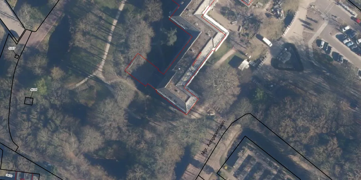 Het perceel waarop Mgr. Aengenentlaan 3-a-101 staat heeft een oppervlakte van 4,1 ha. Dit is een zeer groot perceel. De perceeloppervlakte wordt geregistreerd door het Kadaster. Gedetailleerde informatie over de maten van dit perceel kunt u vinden in het rapport Kadastrale kaart met maatvoering van Mgr. Aengenentlaan 3-a-101.