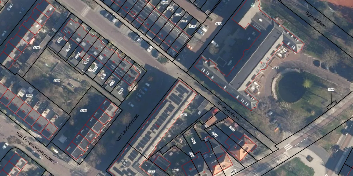 Het perceel waarop van Leydenstraat 60 staat heeft een oppervlakte van 967 m². Dit is een groot perceel. De perceeloppervlakte wordt geregistreerd door het Kadaster. Gedetailleerde informatie over de maten van dit perceel kunt u vinden in het rapport Kadastrale kaart met maatvoering van van Leydenstraat 60.