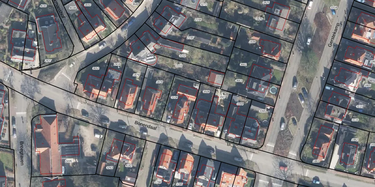 Het perceel waarop Bonendaal 25 staat heeft een oppervlakte van 387 m². Dit is een groot perceel. De perceeloppervlakte wordt geregistreerd door het Kadaster. Gedetailleerde informatie over de maten van dit perceel kunt u vinden in het rapport Kadastrale kaart met maatvoering van Bonendaal 25.