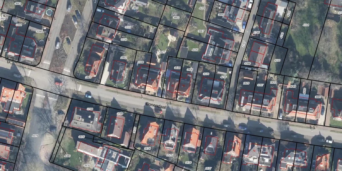 Het perceel waarop Bonendaal 41 staat heeft een oppervlakte van 226 m². Dit is een middelgroot perceel. De perceeloppervlakte wordt geregistreerd door het Kadaster. Gedetailleerde informatie over de maten van dit perceel kunt u vinden in het rapport Kadastrale kaart met maatvoering van Bonendaal 41.