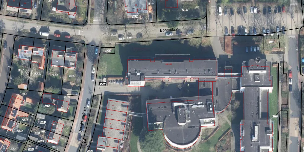 Het perceel waarop Bonendaal 74 staat heeft een oppervlakte van 1,3 ha. Dit is een zeer groot perceel. De perceeloppervlakte wordt geregistreerd door het Kadaster. Gedetailleerde informatie over de maten van dit perceel kunt u vinden in het rapport Kadastrale kaart met maatvoering van Bonendaal 74.