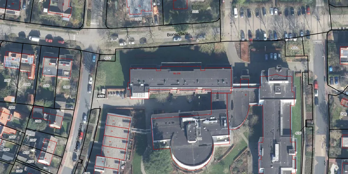 Het perceel waarop Bonendaal 86 staat heeft een oppervlakte van 1,3 ha. Dit is een zeer groot perceel. De perceeloppervlakte wordt geregistreerd door het Kadaster. Gedetailleerde informatie over de maten van dit perceel kunt u vinden in het rapport Kadastrale kaart met maatvoering van Bonendaal 86.