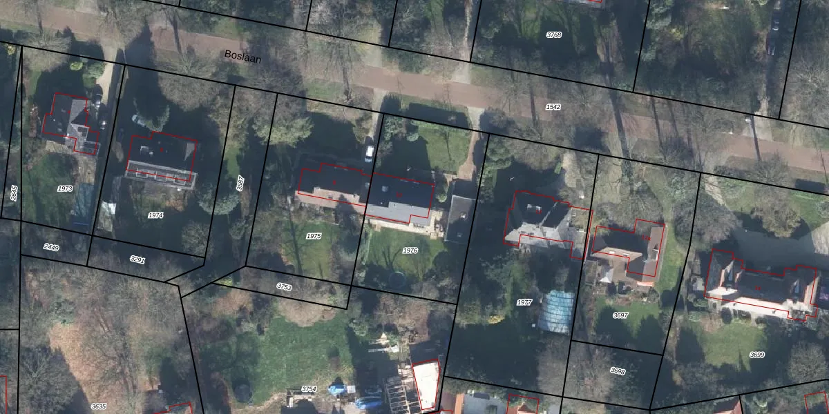 Het perceel waarop Boslaan 10 staat heeft een oppervlakte van 1103 m². Dit is een zeer groot perceel. De perceeloppervlakte wordt geregistreerd door het Kadaster. Gedetailleerde informatie over de maten van dit perceel kunt u vinden in het rapport Kadastrale kaart met maatvoering van Boslaan 10.