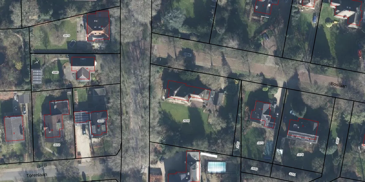 Het perceel waarop Boslaan 2 staat heeft een oppervlakte van 2000 m². Dit is een zeer groot perceel. De perceeloppervlakte wordt geregistreerd door het Kadaster. Gedetailleerde informatie over de maten van dit perceel kunt u vinden in het rapport Kadastrale kaart met maatvoering van Boslaan 2.