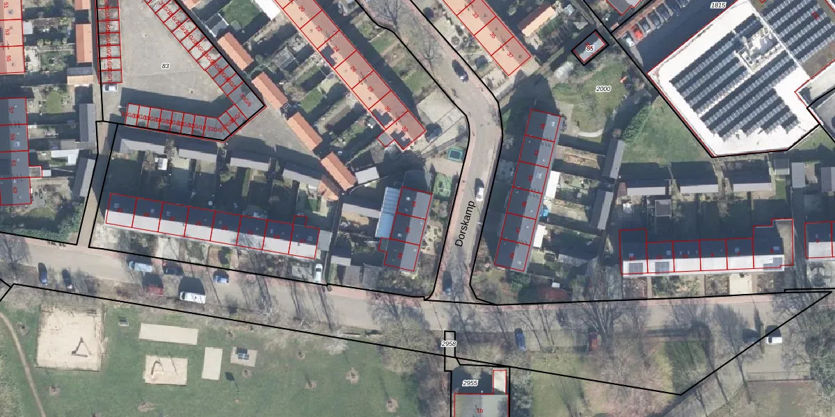 Het perceel waarop Dorskamp 34 staat heeft een oppervlakte van 1,1 ha. Dit is een zeer groot perceel. De perceeloppervlakte wordt geregistreerd door het Kadaster. Gedetailleerde informatie over de maten van dit perceel kunt u vinden in het rapport Kadastrale kaart met maatvoering van Dorskamp 34.