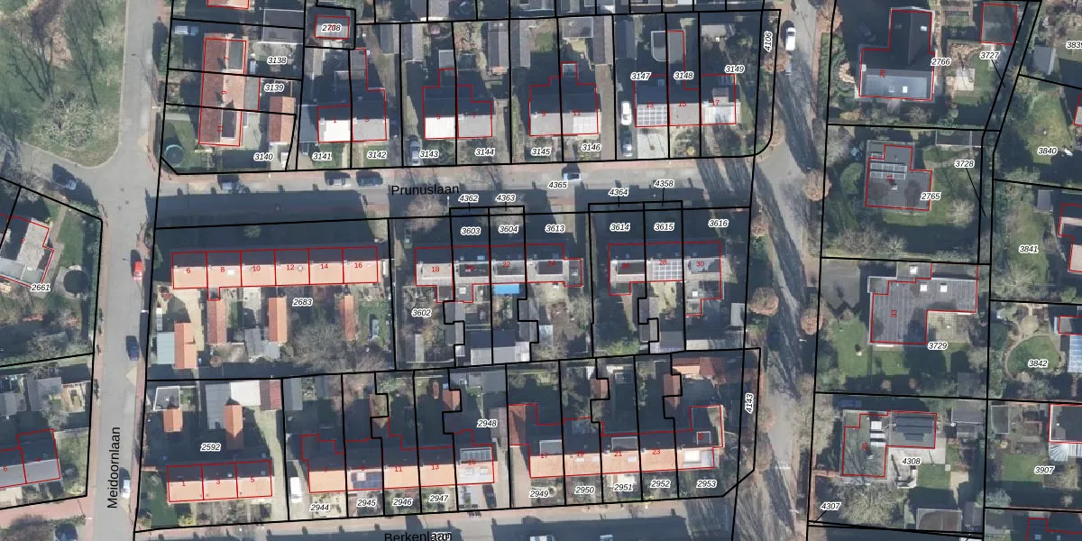 Het perceel waarop Prunuslaan 24 staat heeft een oppervlakte van 322 m². Dit is een groot perceel. De perceeloppervlakte wordt geregistreerd door het Kadaster. Gedetailleerde informatie over de maten van dit perceel kunt u vinden in het rapport Kadastrale kaart met maatvoering van Prunuslaan 24.