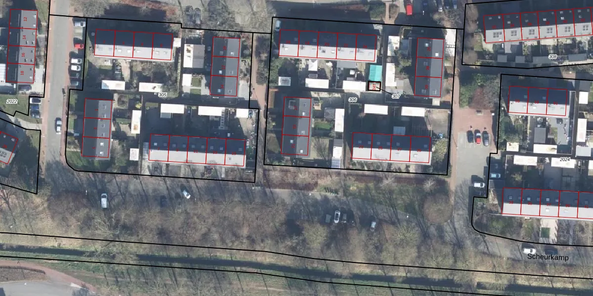 Het perceel waarop Scheurkamp 21 staat heeft een oppervlakte van 3088 m². Dit is een zeer groot perceel. De perceeloppervlakte wordt geregistreerd door het Kadaster. Gedetailleerde informatie over de maten van dit perceel kunt u vinden in het rapport Kadastrale kaart met maatvoering van Scheurkamp 21.