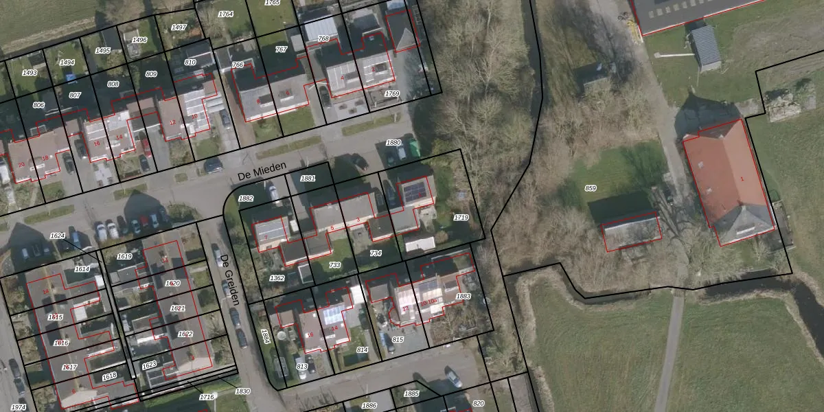De Mieden 1 is gelegen op kadastraal perceel WRG04C1719. Deze kadastrale aanduiding is uniek en wordt gebruikt door het Kadaster om eigendomsrechten en andere zakelijke rechten vast te leggen. Het perceel maakt onderdeel uit van de kadastrale gemeente Warrega.